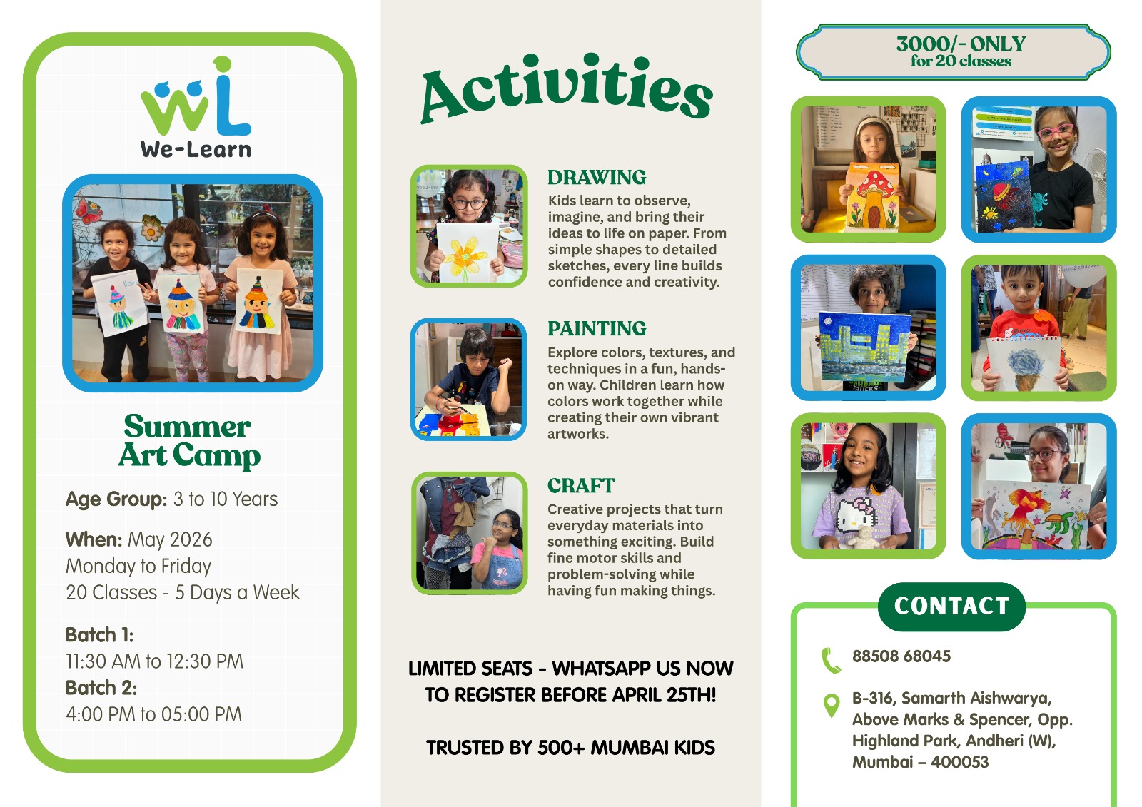 WeLearn has been an absolute game-changer for my art journey. The teachers at WeLearn were incredibly supportive and insightful, providing me with the guidance and resources I needed to develop a strong portfolio for college applications. The studio was well-equipped with a variety of materials and facilities, giving me ample opportunities to experiment and explore different mediums. I'm incredibly grateful for the knowledge and confidence I gained at WeLearn, which helped me secure a place at my dream art school.
